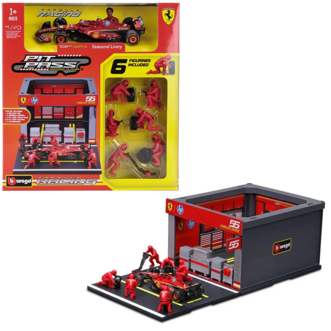 BBURAGO – FERRARI – F1 SF-24 DIORAMA GARAGE PIT-STOP TEAM SCUDERIA FERRARI N 55 SEASON 2024 CARLOS SAINZ WITH CREW FIGURE AND ACCESSORIES