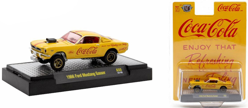 M2 MACHINES 1966 Ford Mustang Gasser in Yellow with Red Coca-cola Decals