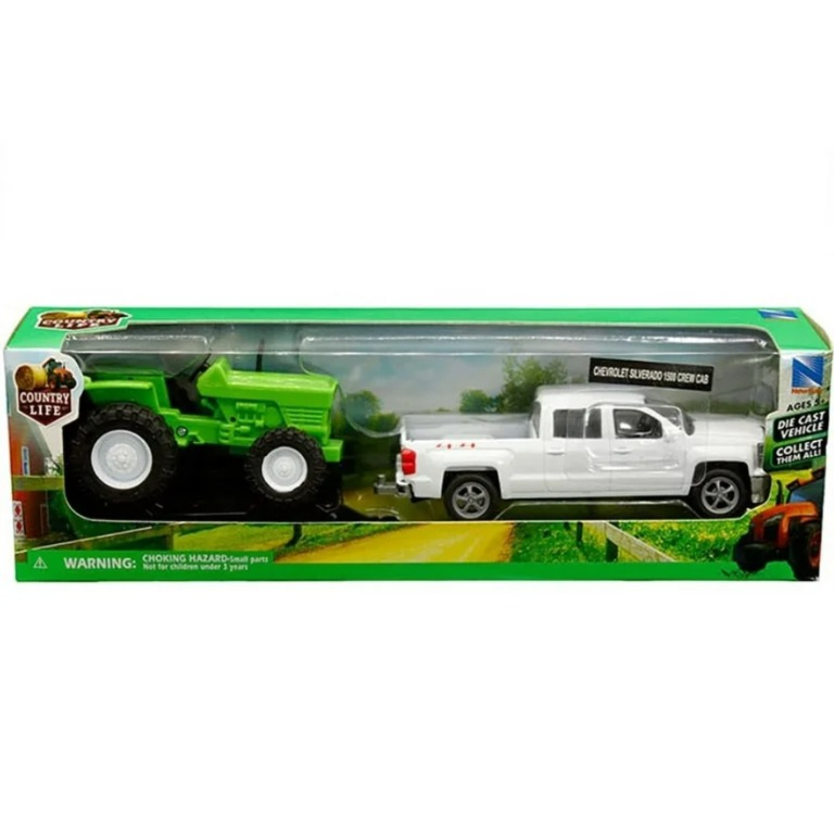 New Ray Chevy Silverado Pickup with Farm Tractor and Tractor, White